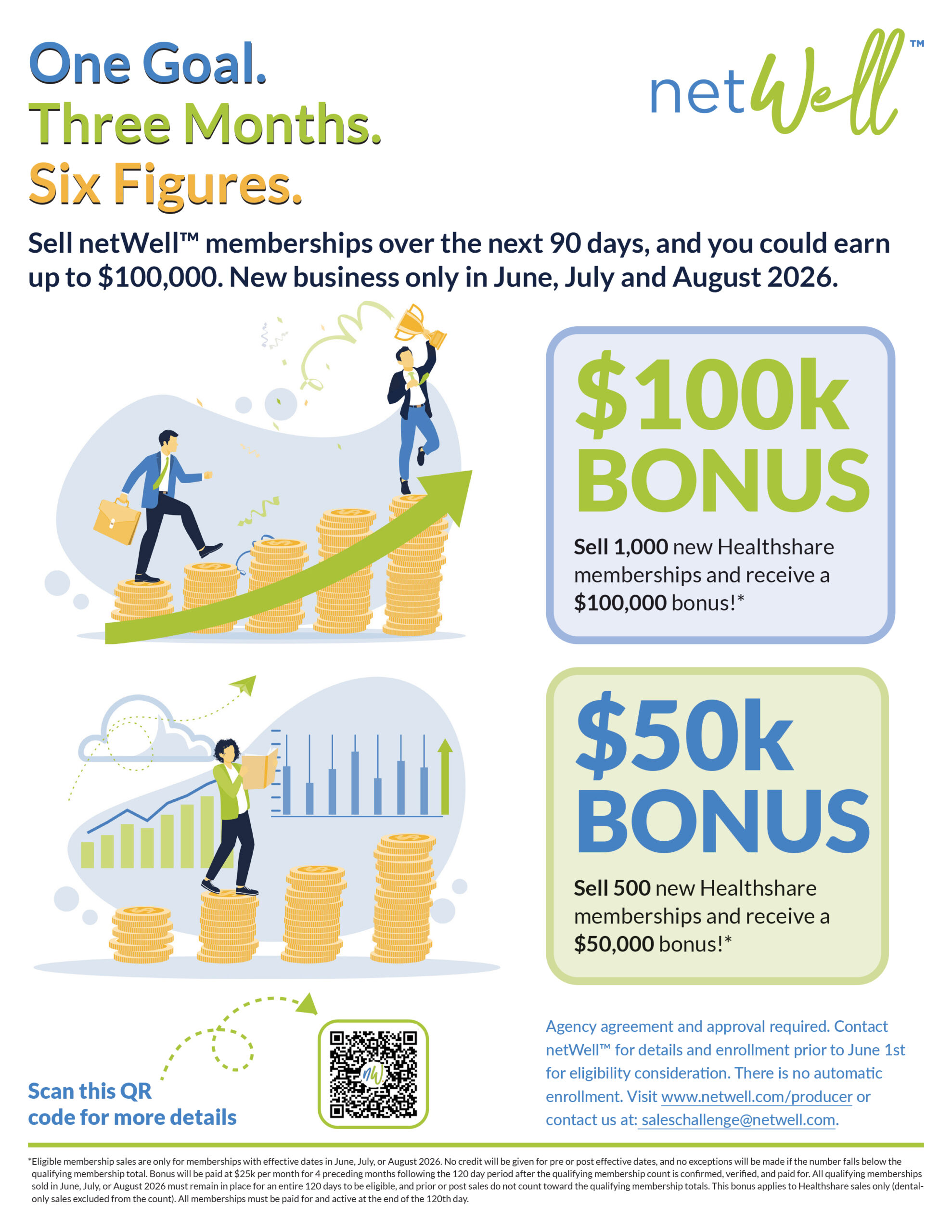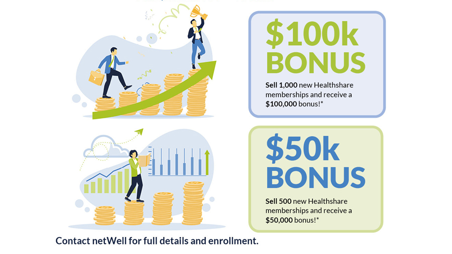 * Eligible membership sales are only for memberships with effective dates in June, July, or August 2026. No credit will be given for pre or post effective dates, and no exceptions will be made if the number falls below the qualifying membership total. Bonus will be paid at $25k per month for 4 preceding months following the 120 day period after the qualifying membership count is confirmed, verified, and paid for. All qualifying memberships sold in June, July, or August 2026 must remain in place for an entire 120 days to be eligible, and prior or post sales do not count toward the qualifying membership totals. This bonus applies to Healthshare sales only (dental-only sales excluded from the count). All memberships must be paid for and active at the end of the 120th day.